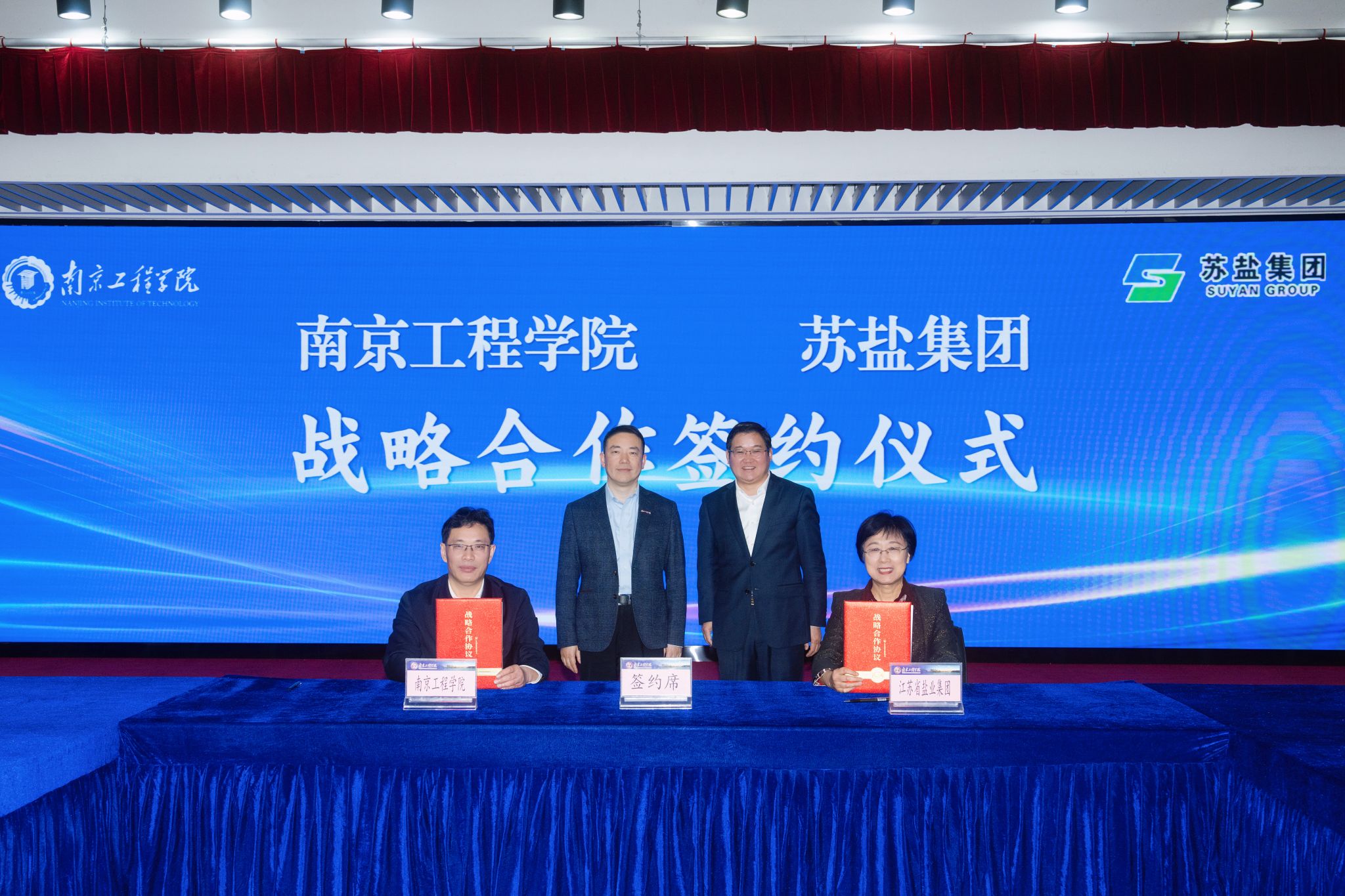 在与会人员的共同见证下,校企双方共同签订战略合作协议,并为“苏盐集团人才教育培训基地”和“大学生就业实习基地”揭牌。