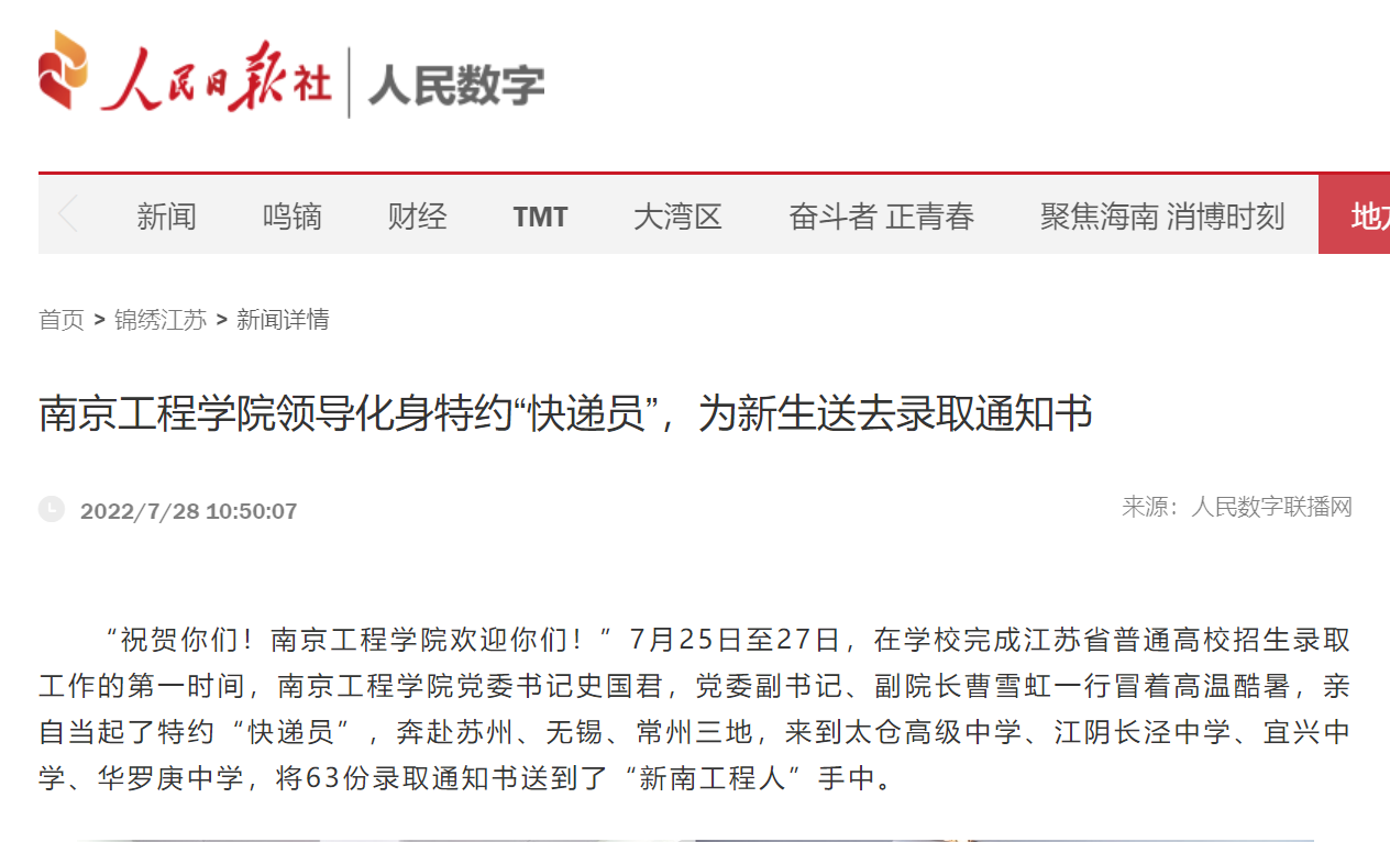 “祝贺你们!凯发k8官网欢迎你们!”7月25日至27日,在凯发完成江苏省普通高校招生录取工作的第一时间,凯发k8官网党委书记史国君,党委副书记、副院长曹雪虹一行冒着高温酷暑,亲自当起了特约“快递员”,奔赴苏州、无锡、常州三地,来到太仓高级中学、江阴长泾中学、宜兴中学、华罗庚中学,将63份录取通知书送到了“新南工程人”手中。