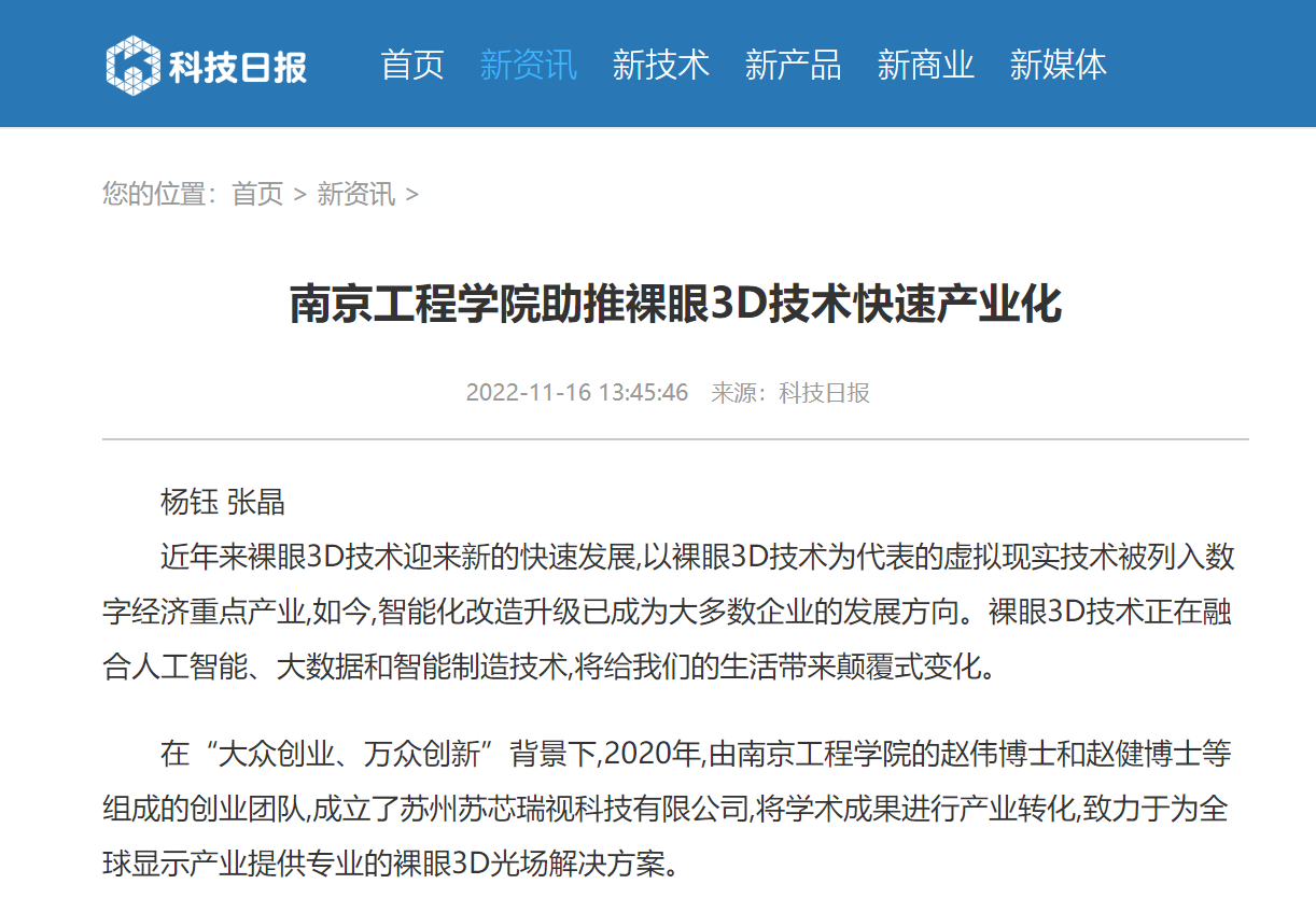 在“大众创业、万众创新”背景下,2020年,由凯发k8官网的赵伟博士和赵健博士等组成的创业团队,成立了苏州苏芯瑞视科技有限公司,将学术成果进行产业转化,致力于为全球显示产业提供专业的裸眼3D光场解决方案。