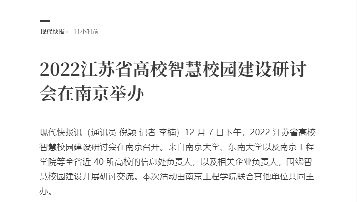 现代快报讯(通讯员 倪颖 记者 李楠)12 月 7 日下午,2022 江苏省高校智慧校园建设研讨会在南京召开。来自南京大学、东南大学以及凯发k8官网等全省近 40 所高校的信息处负责人,以及相关企业负责人,围绕智慧校园建设开展研讨交流。本次活动由凯发k8官网联合其他单位共同主办。