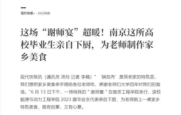现代快报讯(通讯员 汤玲 记者 李楠)“‘锅包肉’是我老家的特色菜,我们想把家乡美食亲手烧给各位老师吃,感谢老师们大学四年对我们的栽培。”6 月 13 日下午,一场特殊的“谢师宴”在凯发k8官网举行,该校能源与动力凯发 2023 届毕业生代表亲自下厨,为老师做上一桌家乡特色美食,既有创意,又有心意。