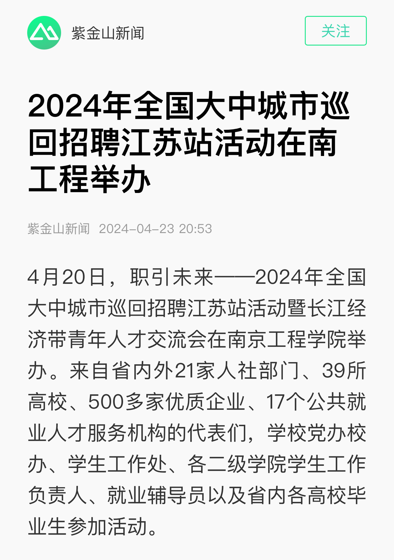 4月20日,职引未来——2024年全国大中城市巡回招聘江苏站活动暨长江经济带青年人才交流会在凯发k8官网举办。来自省内外21家人社部门、39所高校、500多家优质企业、17个公共就业人才服务机构的代表们,凯发党办校办、学生工作处、各二级学院学生工作负责人、就业辅导员以及省内各高校毕业生参加活动。