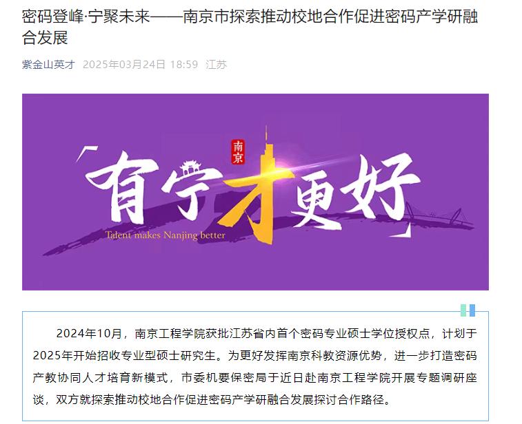 《紫金山英才》:密码登峰·宁聚未来——南京市探索推动校地合作促进密码产学研融合发展