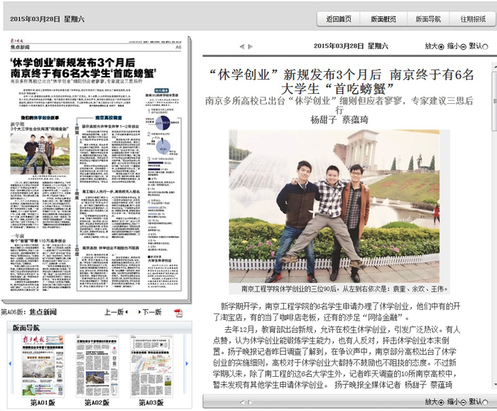 去年12月,教育部出台新规,允许在校生休学创业,引发广泛热议。有人点赞,认为休学创业能锻炼学生能力,也有人反对,抨击休学创业本末倒置。扬子晚报记者昨日调查了解到,在争议声中,南京部分高校出台了休学创业的实施细则,高校对于休学创业大都持不鼓励也不阻挠的态度。不过新学期以来,除了南工程的这6名大学生外,记者昨天调查的10所南京高校中,暂未发现有其他学生申请休学创业。