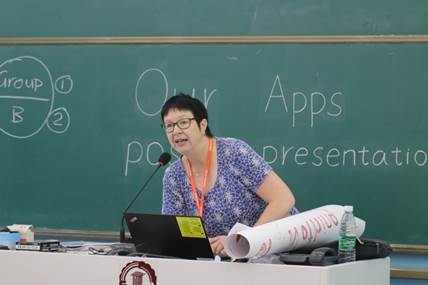 在芬兰籍教师Susan McAnsh和Magda Liontou的指导下,同学们充分发挥自己的想象力,模拟设计出各类新颖,并且功能齐全的应用软件。同学们将本组精心手绘的宣传海报张贴在教室墙壁上,向前来观摩的同学展示其团队的软件设计理念。成果汇报会现场,两个班的同学被分为二十个小组,每组成员依据海报上展示的内容,用英文向在场的老师和同学们分享他们设计的软件特点与用途,并回答对软件的使用、功能、优势、市场需求等方面提出的问题。每一张展示海报旁贴有二维码,现场观摩的同学可以通过扫码在国教院的在线学习平台Moodle中对汇报的小组进行评分。蒋静院长和两位芬兰籍教师全程参与了汇报会,她们在聆听成果汇报的同时,也与大家积极交流互动,让同学们在汇报交流的过程中收获更多的知识。